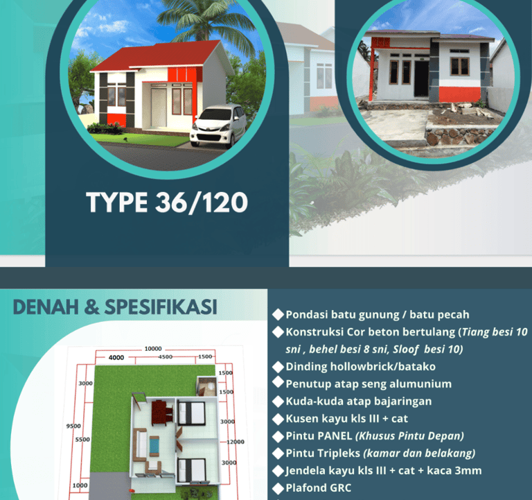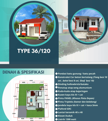Rumah subsidi dengan Luas Bangunan 36 M2 dan Luas Tanah 120 M2. Dilengkapi 2 Kamar Tidur, 1 Kamar Mandi, listrik 1300 Watt, Air Pam Developer dan Carport. Terdapat sisa lahan yang sangat luas di bagian belakang dan samping, menjamin potensi renovasi dan pengembangan di masa depan